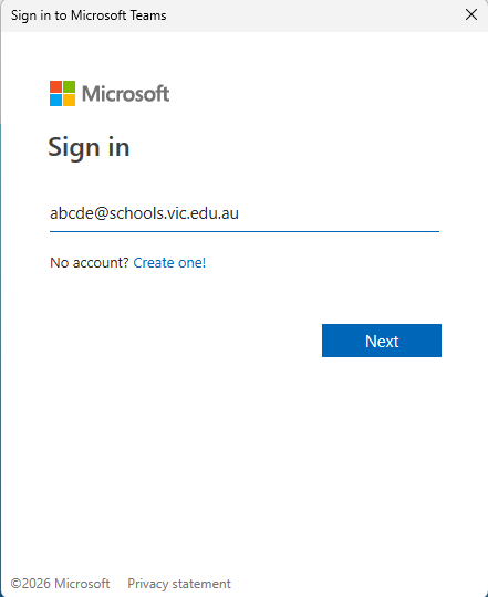 Once installed, Teams will automatically login with your details most of the time, if for whatever reason it asks you to login, please ENSURE your logging in with your “@schools.vic.edu.au” email address, and the password that you use to login to Pulse, Wellio and other Department of Education Services